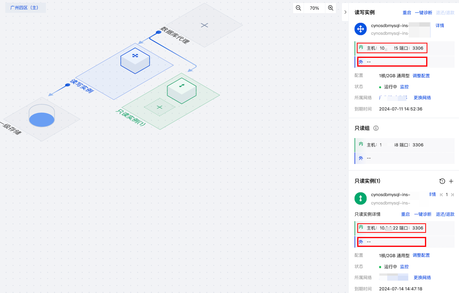 2. 在集群详情下,找到需要查询内/外网 IP 地址的实例,在其所属网络下方可查看该实例的内/外网 IP 地址。