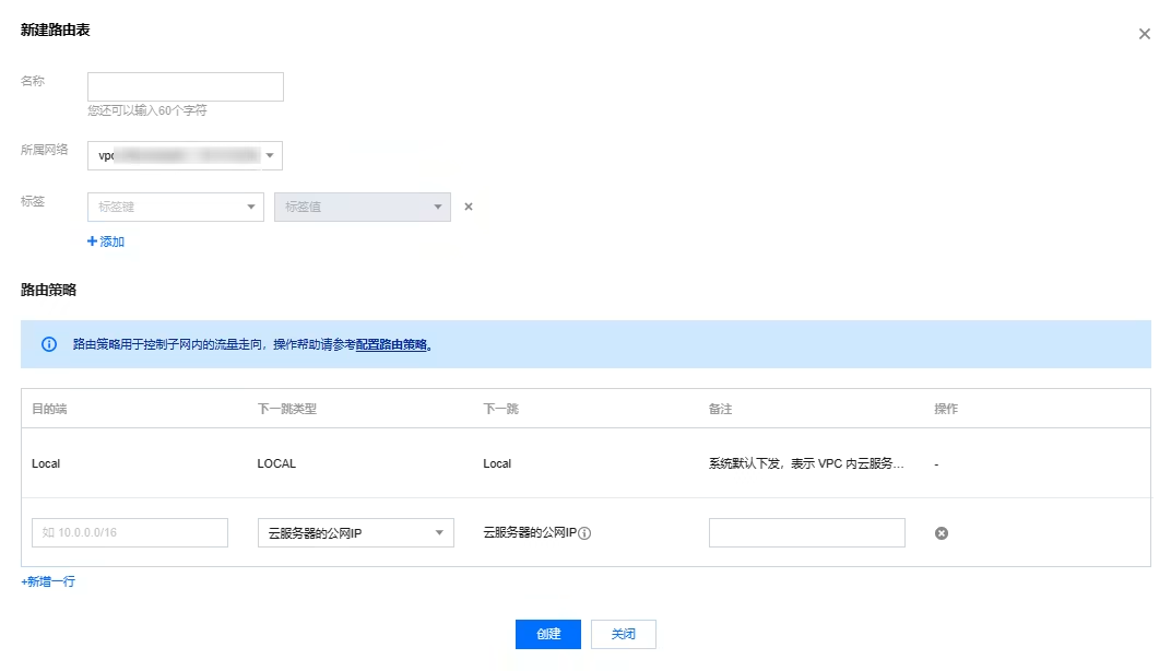 3. 在弹出的对话框中输入名称、所属网络及新建路由策略,单击创建。返回路由表列表即可看到您新建的路由表。