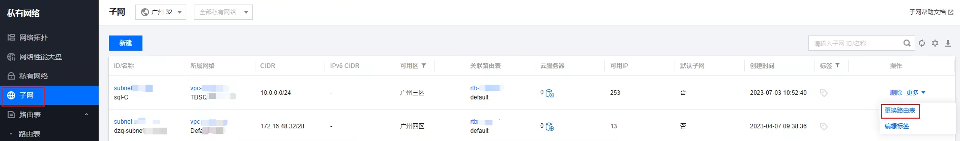 4. 在控制台左侧栏选择子网页,选择需要关联该路由表的子网,在操作列单击更多 > 更换路由表进行关联。