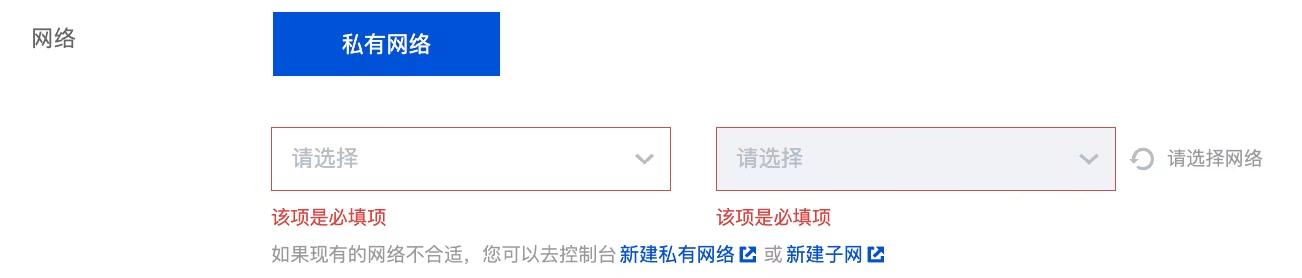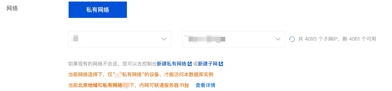 2. 在购买页的网络选项,选择之前创建的私有网络以及相应子网,将新购的云数据库添加进私有网络。