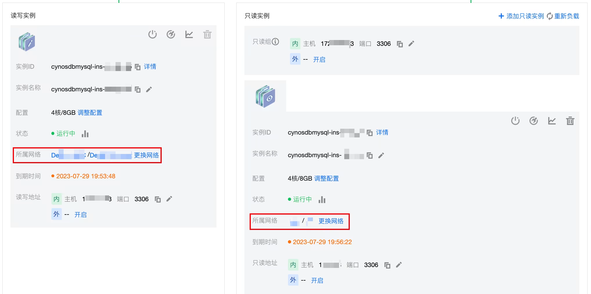 1. 在 集群列表,单击集群 ID,进入集群管理页面。 2. 在集群管理页 > 集群详情页面,读写实例或只读实例的所属网络处,可切换对应的私有网络。