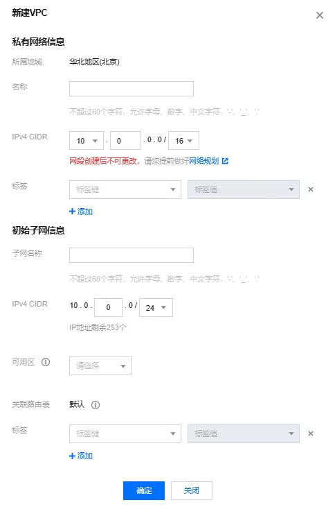 3. 填写私有网络信息和初始子网信息,单击确定。其中,私有网络和子网的 CIDR 创建后不可修改。