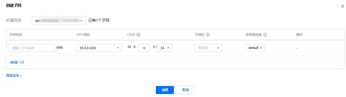 5. (可选)单击+新增一行,可以同时创建多个子网。