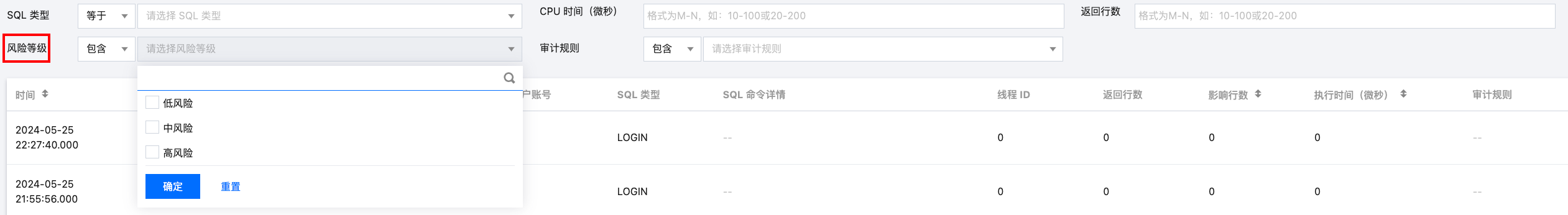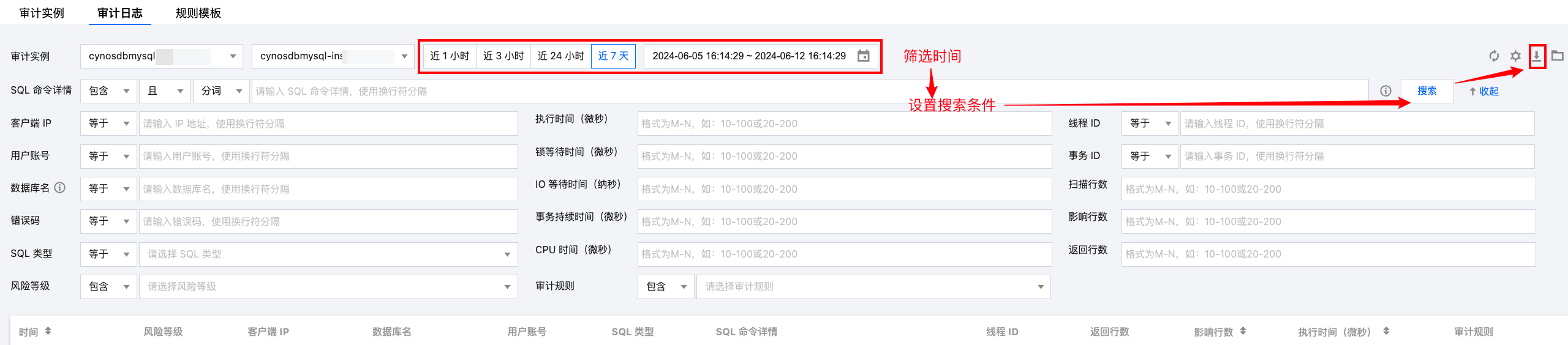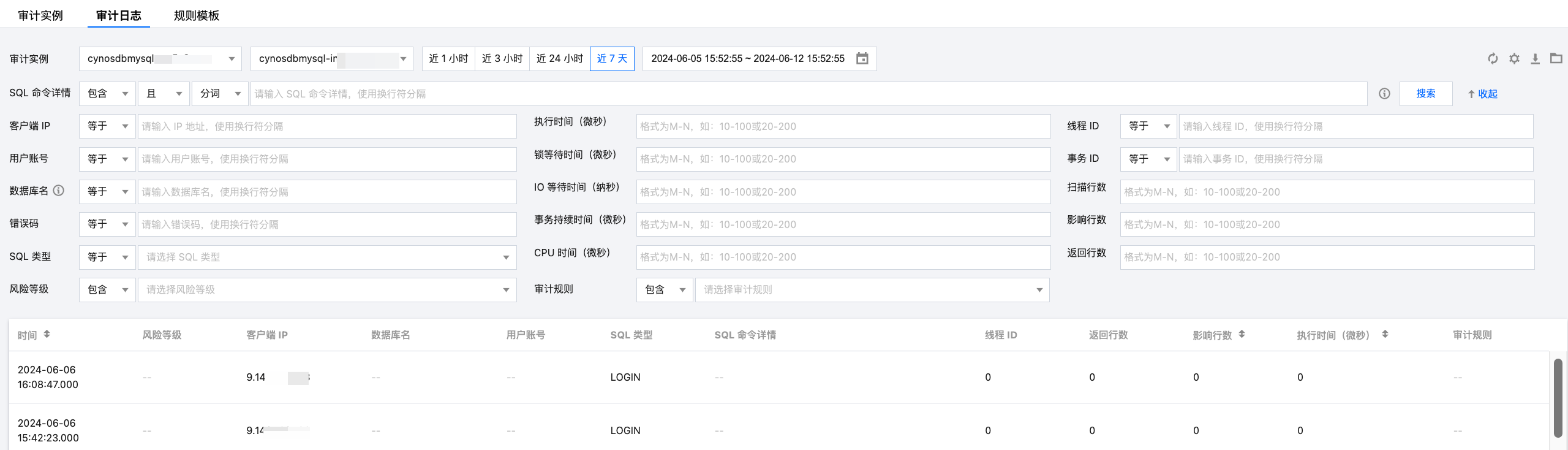 1.2 点击查看审计日志,跳转到对应实例的审计日志页面。可以看到审计日志记录(需有审计日志记录产生),证明数据库审计正常运行中。