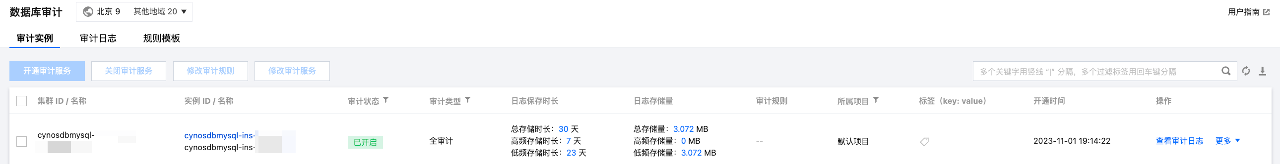 1.1 登录 TDSQL-C MySQL 版控制台,在左侧导航栏选择数据库审计页面。在字段“审计状态”下显示已开启,表明当前账号在指定地域的实例开启了数据库审计功能。