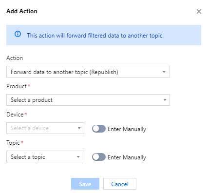 通过将感兴趣的消息字段转发到另一个 Topic,即可实现不同设备间的 M2M 通信。Topic 的填写支持以下方式: