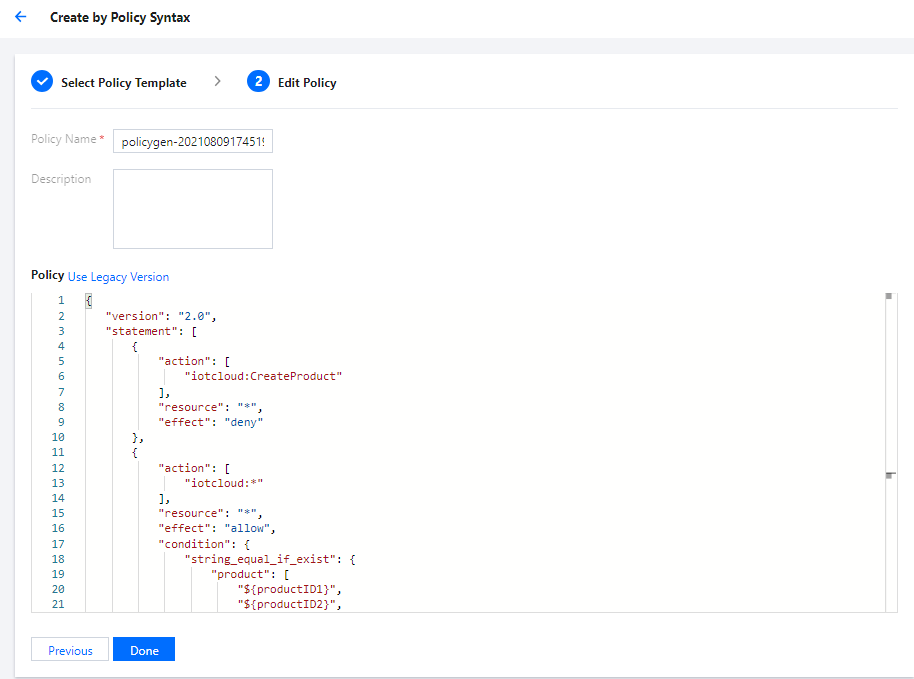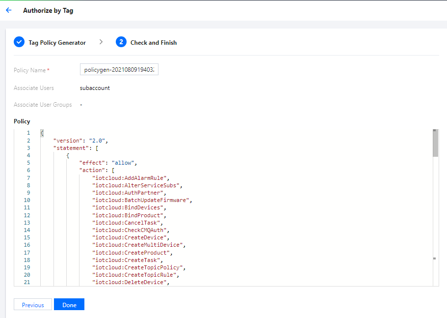 6. 由于物联网通信控制台的限制,设备资源被分配给子用户之后,子用户需获取到产品列表和设备列表信息才可进入设备信息界面,对授权的设备资源进行查看。因此,需要对产品列表和设备列表进行授权,可按照创建策略语法方式完成产品列表和设备列表信息的授权,授权代码如下: