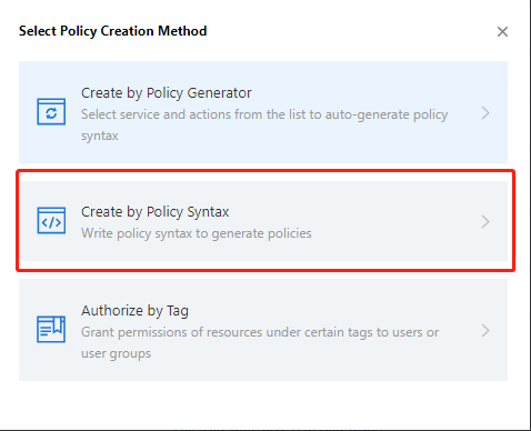 3. 在弹出选择创建策略方式页面,选择按策略语法创建。
