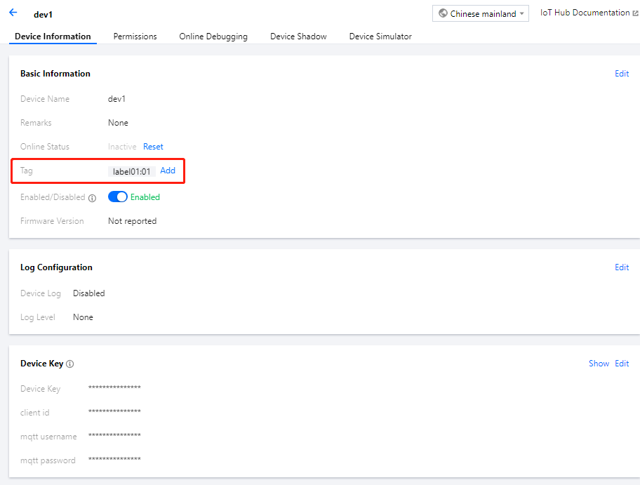 2. 单击“设备信息”页面的“标签信息”,单击添加,填写 key 和 value 等信息进行设备标签添加。