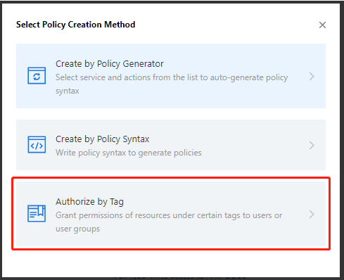 3. 在弹出选择创建策略方式页面,选择按标签授权。