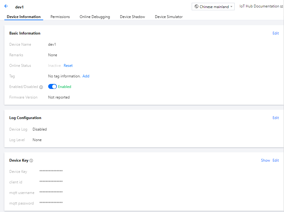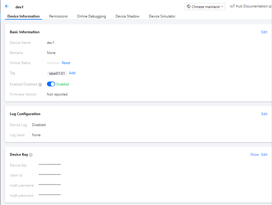 至此,您可以通过物联网通信控制台获取产品的基本信息。