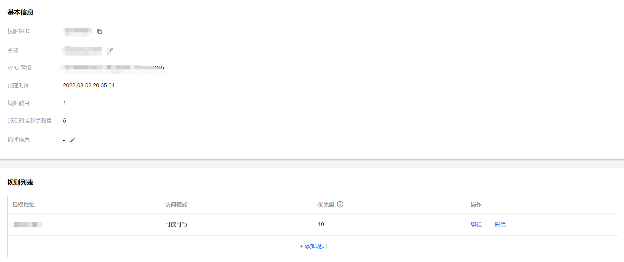 2. 找到需要操作的权限组,单击【添加规则】,进入权限组规则配置页面,可以查看权限组基本信息和权限规则列表。在规则列表中填写授权地址、访问模式、优先级。
