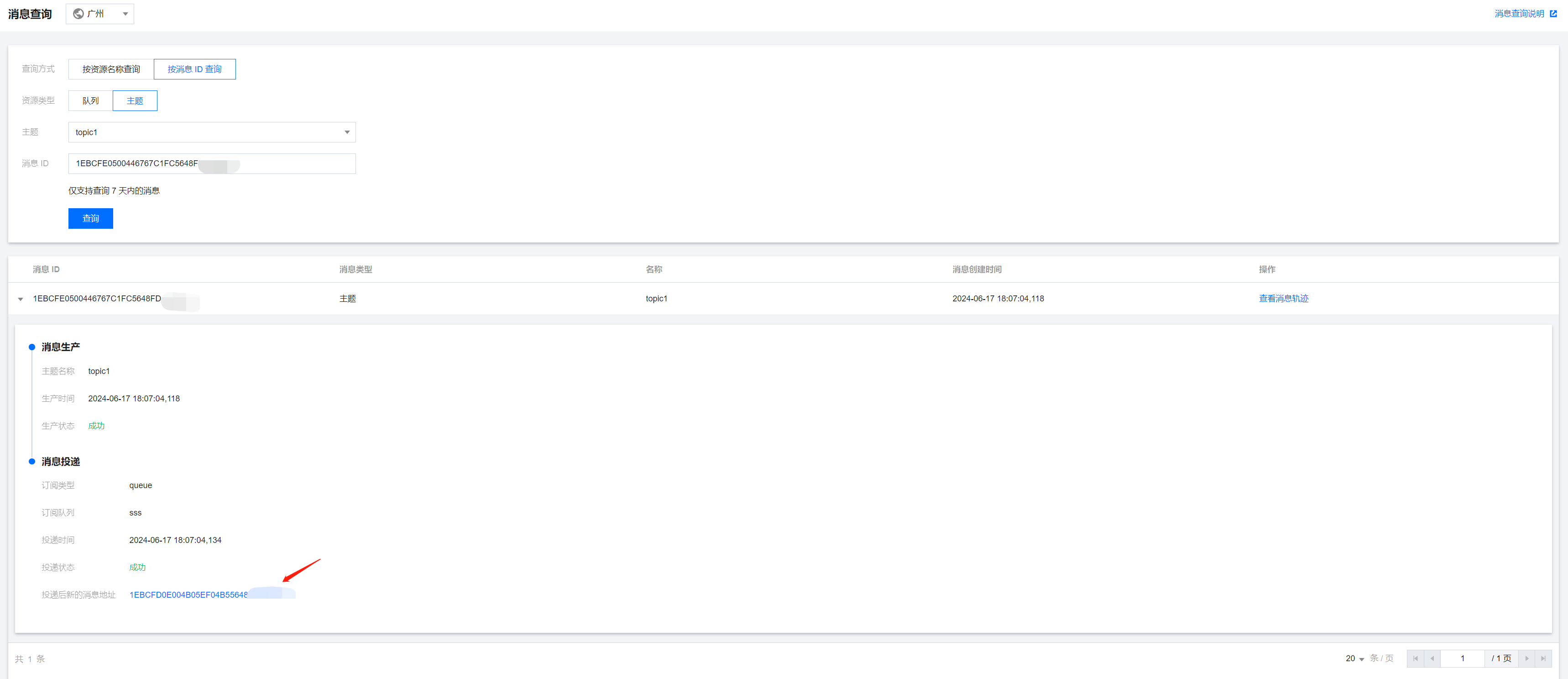 5. 如果查询主题模式的消息,如果消息投递成功,则消息轨迹会展示消息投递出去之后生成的新的消息 ID,直接单击即可跳转到新消息的轨迹查询。