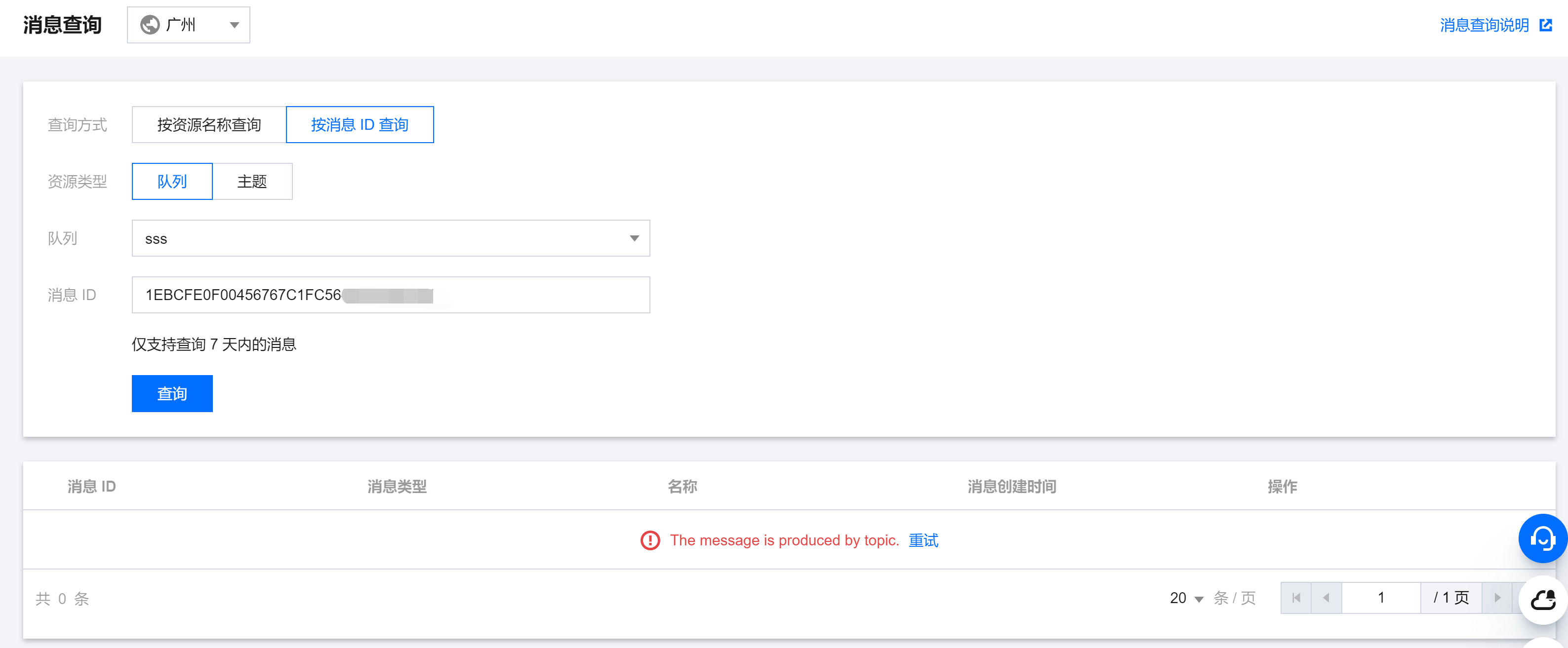 2. 在消息查询页面,首先选择地域和环境,再根据实际情况选择需要查询的方式(单击按资源名称查询并选择时间范围或者单击按消息 ID 进行查询)进行查询,如果您知道对应的消息 ID,建议输入消息 ID 精准查询。