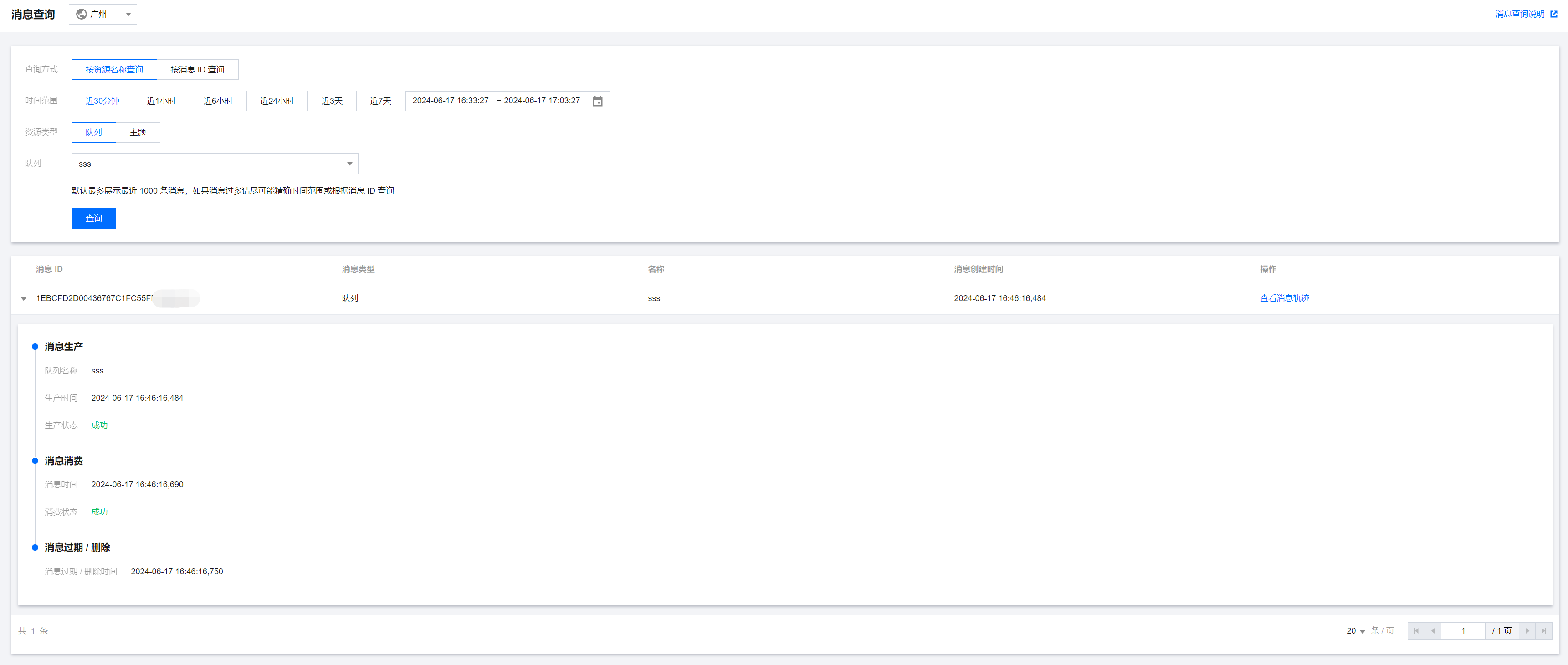 当您需要排查以下问题时,就可以使用 TDMQ CMQ 版控制台的消息查询功能,按照 “资源&时间维度” 或者直接根据消息 ID,来查看具体某条消息的详情和消息轨迹。