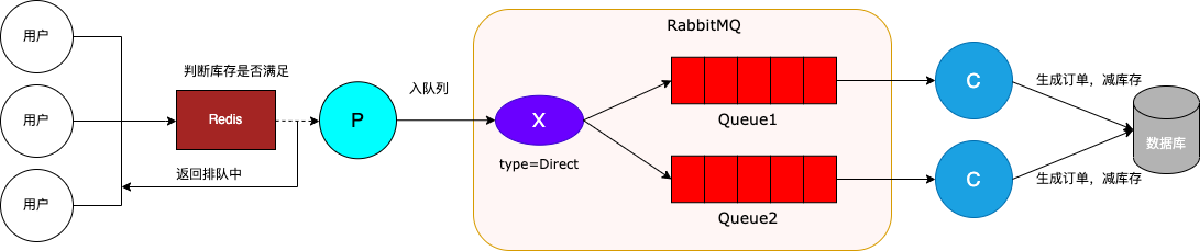 这种方式是针对“秒杀”场景的,依据“先到先得”原则来保证公平公正,所有用户都可以抢购,然后等待订单处理,最后生成订单(如果库存不足,则生成订单失败)。