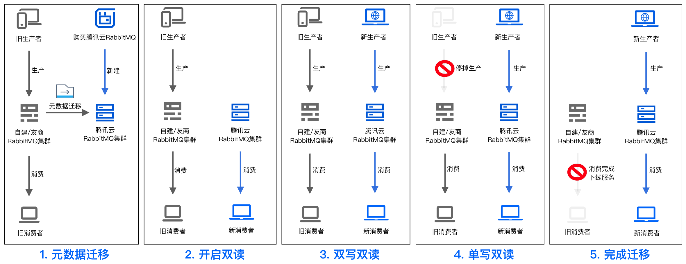 1.元数据迁移 | 1. 购买腾讯云 RabbitMQ 集群 2. 完成元数据迁移 3. 保持旧集群读写状态 | 旧集群:读写 新集群:就绪 |