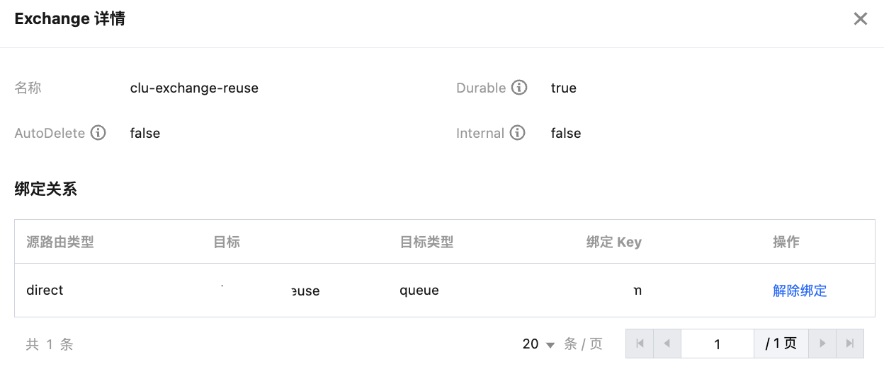 开源托管版集群中名为“AMQP default exchange”的默认 Exchange 默认绑定到每个 Queue,routing key 等于 Queue 名称。默认 Exchange 的绑定关系无法取消或删除。