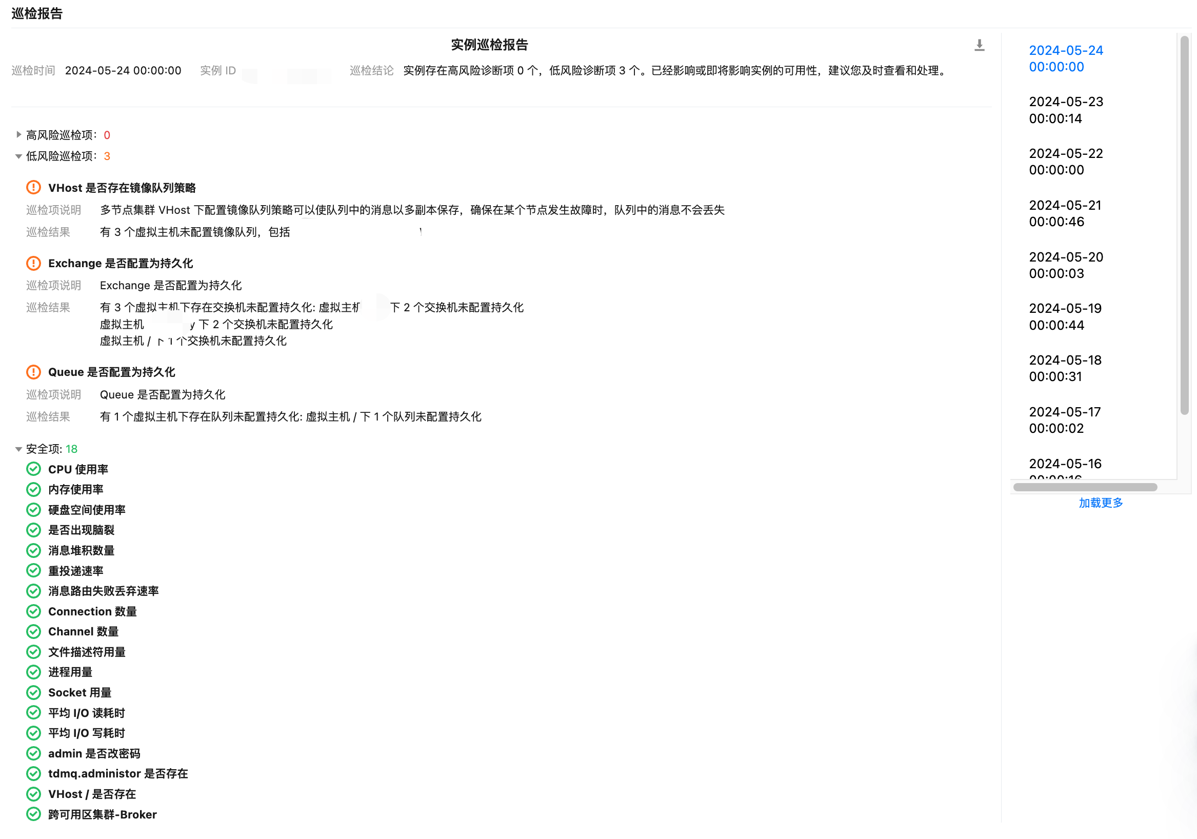 随着监控指标逐渐增加,对读懂运维指标的要求也逐渐升高。TDMQ RabbitMQ 版推出智能巡检能力,能够主动排查集群问题和隐患,并基于专家经验沉淀给出问题解决方案,自动归纳健康检查结果生成报告。
