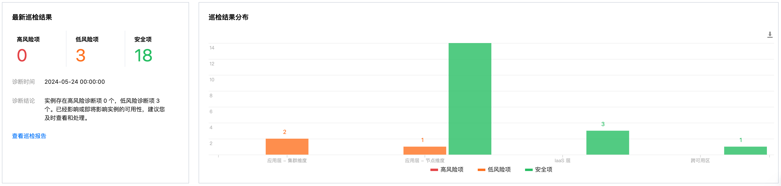 巡检结果统计并展示了集群的巡检结果及其趋势变化,方便用户查看集群近期的健康状况。通过高风险、低风险和安全3种状态来展示集群的健康状况: