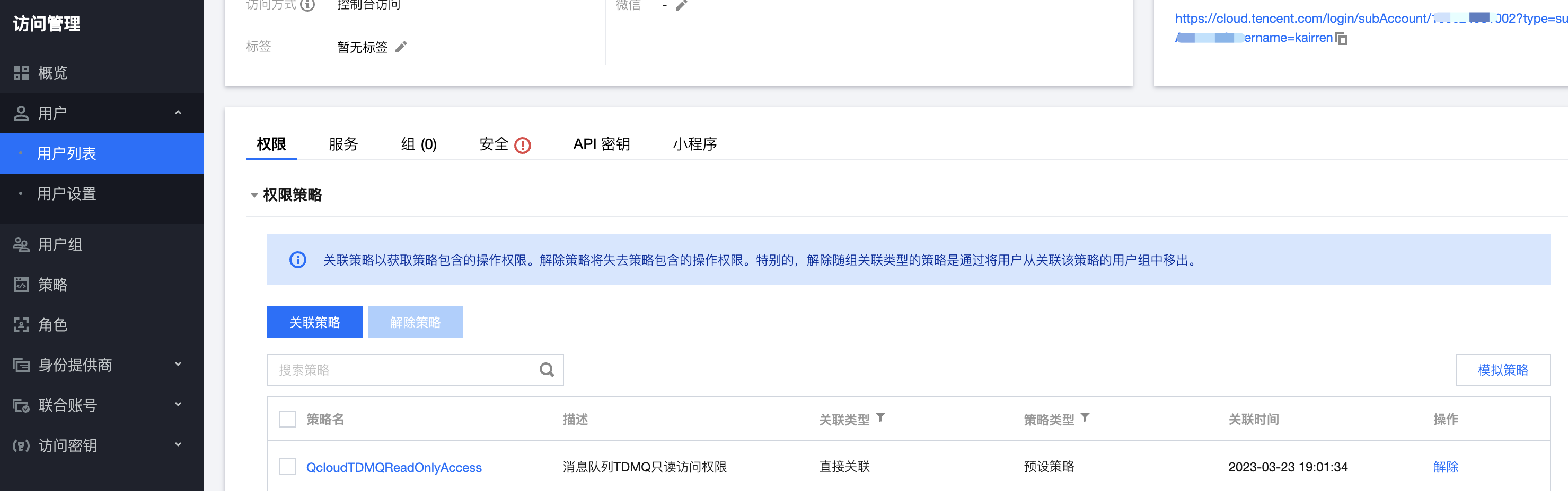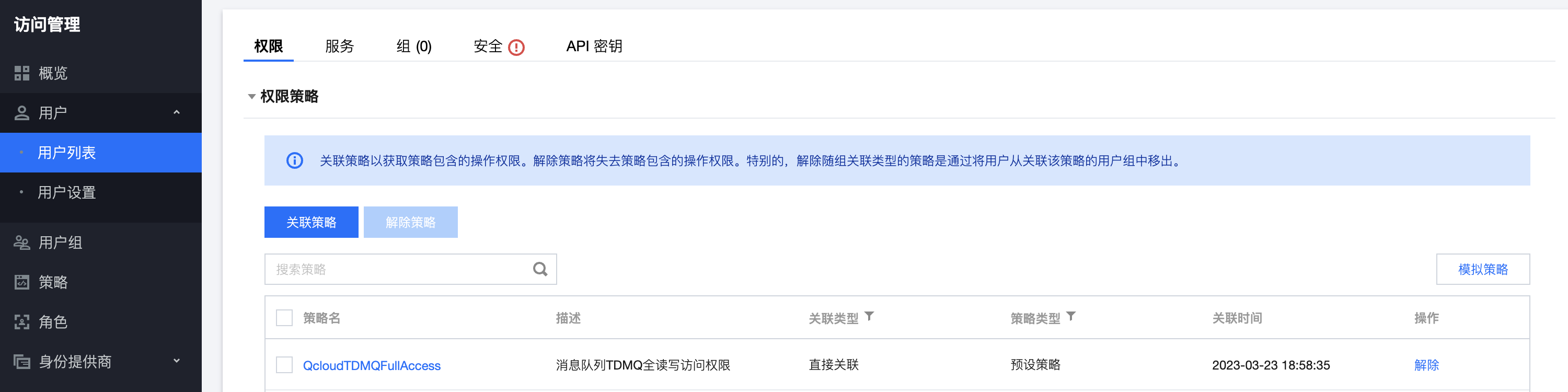4. 单击确定完成授权。该策略会显示在用户的策略列表中。