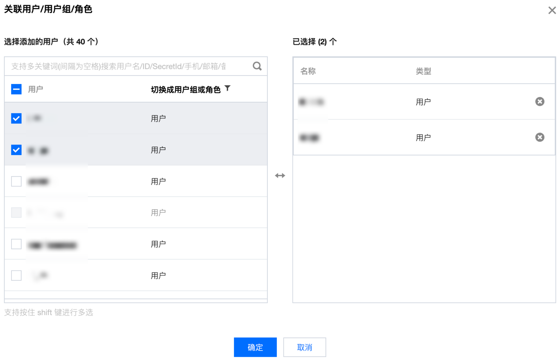 3. 在搜索结果中,单击操作栏的关联用户/组/角色,选择需要授权的子账号。