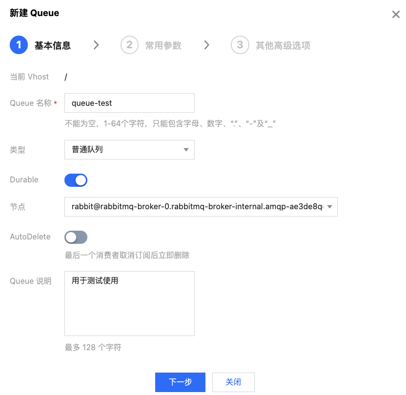2. 填写 Queue 名称,类型选择普通队列,其他选项保持默认即可。