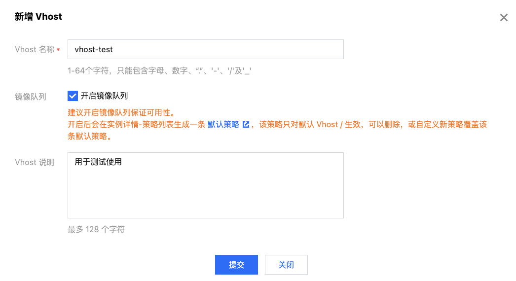 4. 在新建 Vhost 对话框,设置 Vhost 名称和说明,其他选项可保持默认。