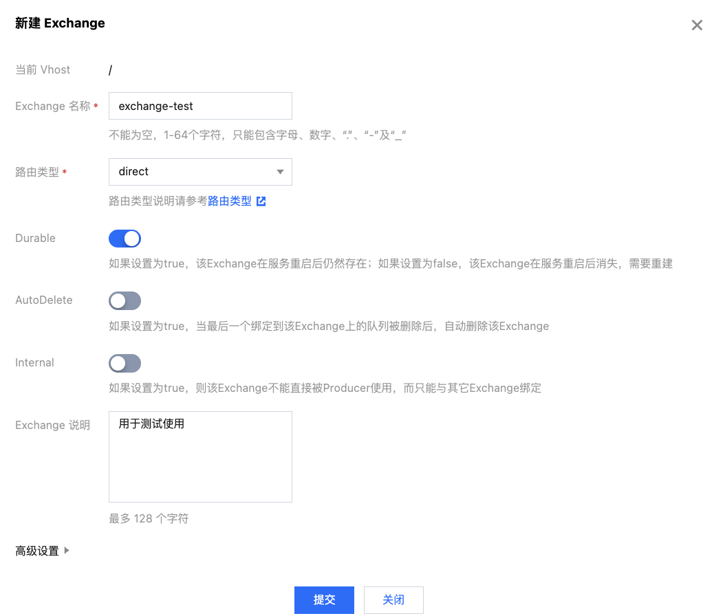 Vhost 用作逻辑隔离,不同 Vhost 之间的 Exchange 和 Queue 相互隔离,互不干扰。本文介绍在控制台新建一个 Vhost,并在 Vhost 下创建 Exchange 和 Queue 等资源的操作步骤,用于后续收发消息测试。
