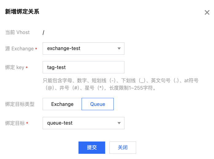 3. 源 Exchange 选择刚刚创建的 Exchange,填写绑定 key,绑定类型选择 Queue,绑定目标选择刚刚创建好的 Queue。