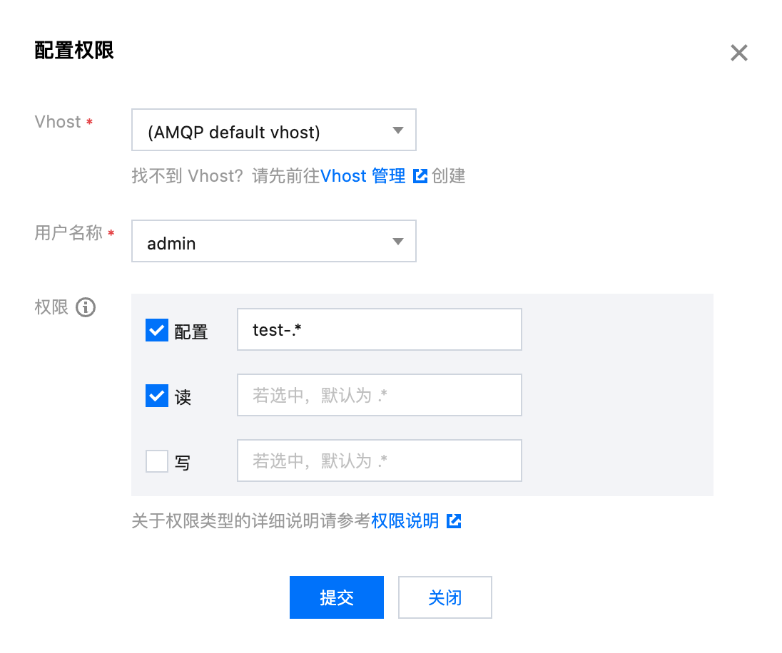 权限规则设置支持使用正则表达式匹配资源。例如,勾选“配置”且在输入框内输入 “test-.*”,则表示授权给该用户当前 Vhost 下,所有名称以 “test-” 开头的资源的配置权限。