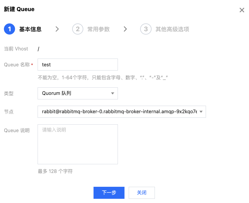 基本信息 | 当前 Vhost | 是 | 表示正在给哪个 Vhost 创建 Queue。 |