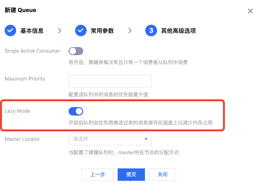 在创建 Queue 时,在其他高级选项中选择是否开启 Lazy Mode。具体步骤请参考创建 Queue。