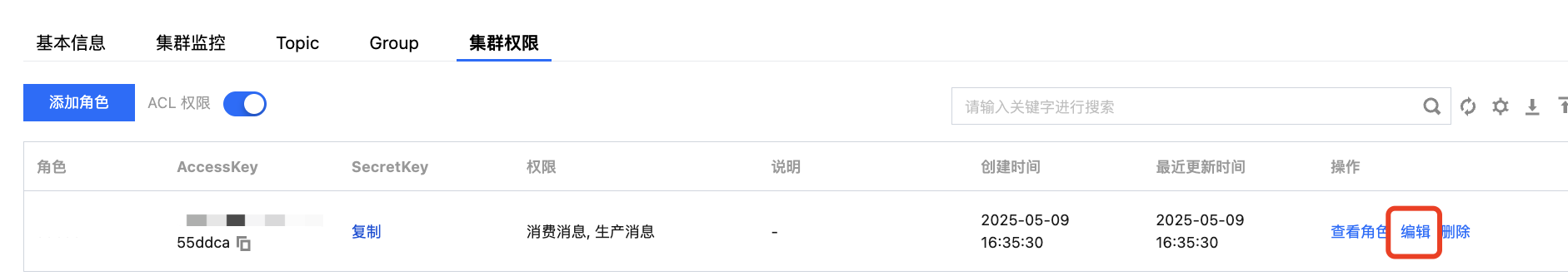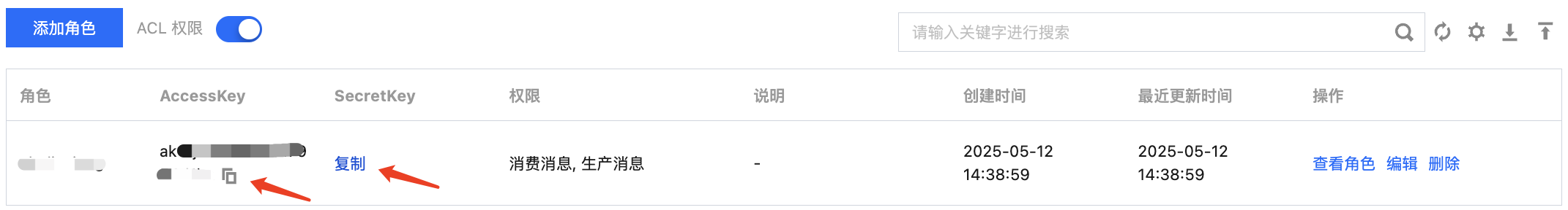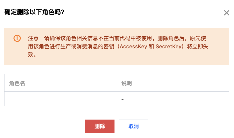 删除角色后,原先使用该角色进行生产或消费消息的密钥( AccessKey 和 SecretKey )将立即失效。请确保当前业务已经没有使用该角色进行消息的生产消费,否则可能会出现客户端无法生产消费而导致的异常。