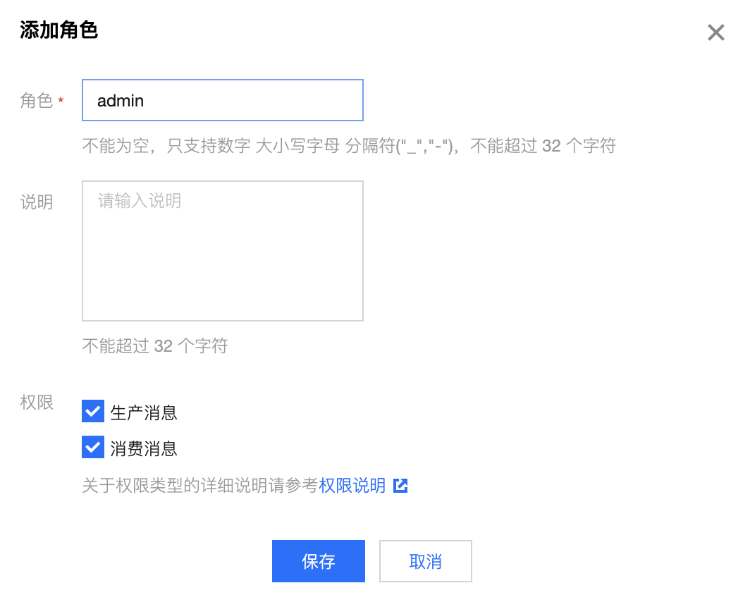 角色 | 自定义角色名称,用于区分不同的用户。 需符合命名规则:只支持数字 大小写字母 分隔符("_","-"),不能超过 32 个字符。 用户名创建成功后,不可修改。 |