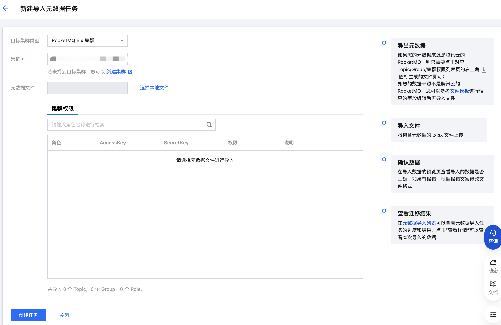 您可以通过角色列表页右上角的 按钮直接导出元数据,元数据的导出格式为 .xlsx 格式的表格文件。 如果您需要将一个集群的角色和权限导入到另一个集群内,在导出元数据后,您可以单击角色列表页右上角的 按钮,将权限数据导入到指定的集群内。如果您的数据来源不是腾讯云的 RocketMQ,可以参考文件模板链接处找到对应的模板,进行相应的字段编辑后再导入文件。