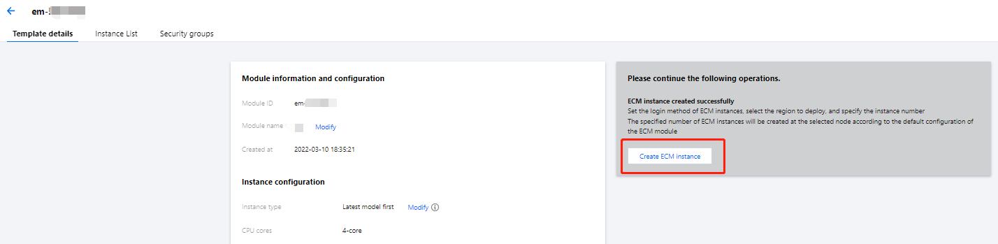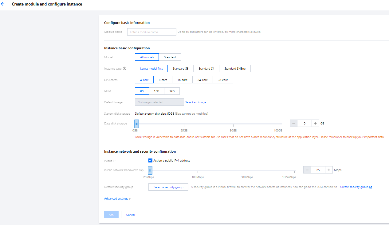 3. 在创建模块及实例配置页面,根据提示,配置以下信息: