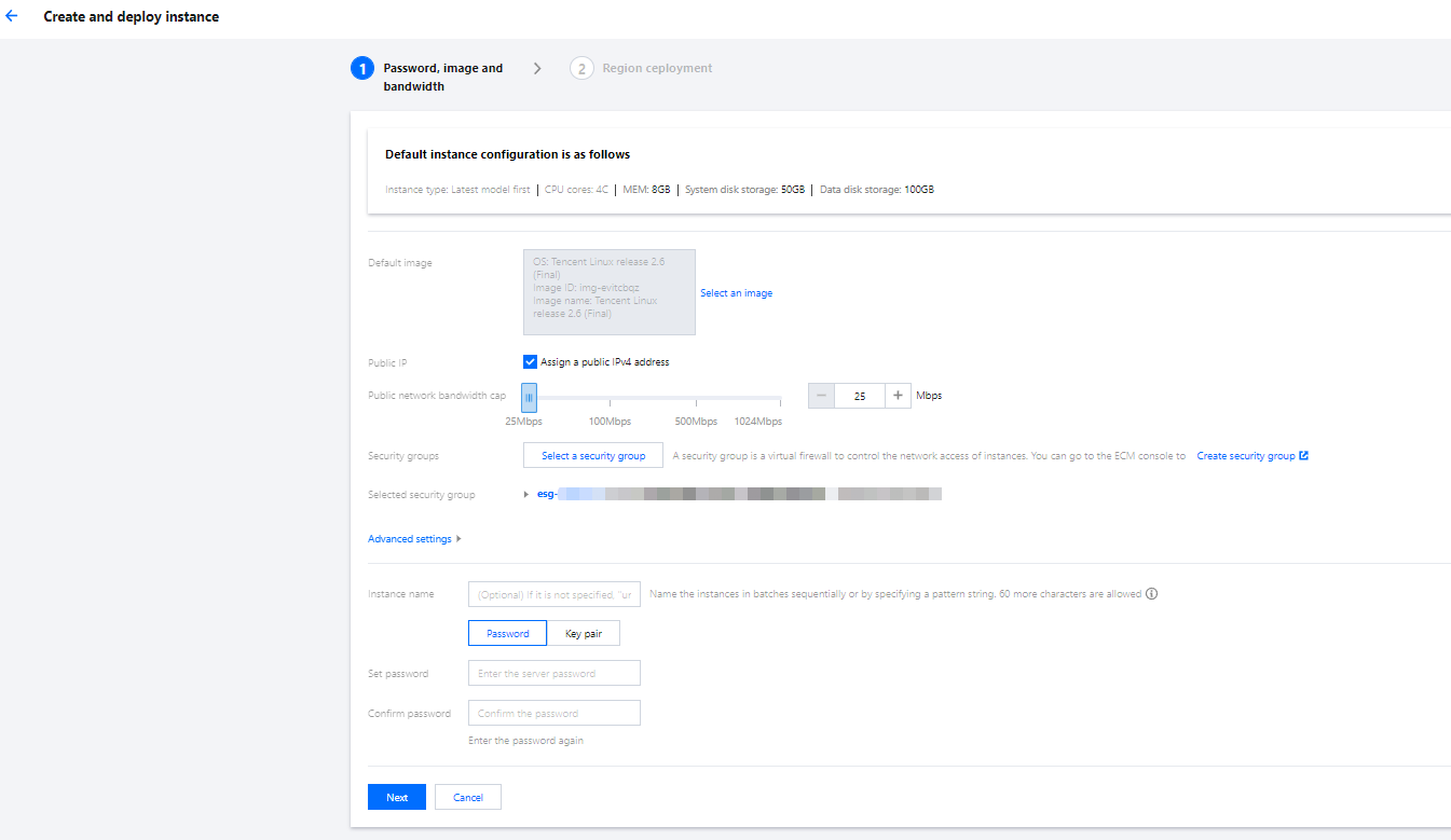2. 在创建实例进行部署的密码,镜像及带宽页面,根据提示,配置以下信息: