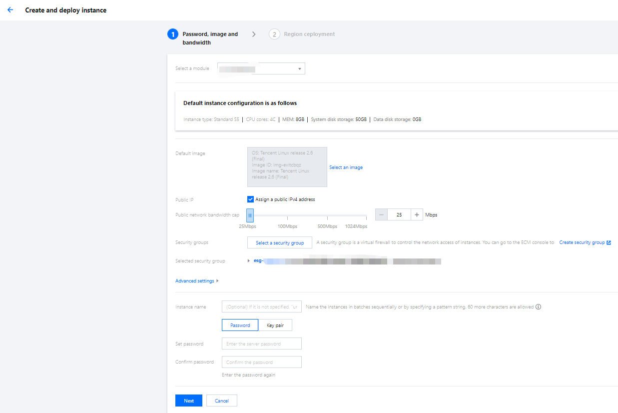 5. 在创建实例进行部署的区域部署页面,根据提示,配置以下信息: