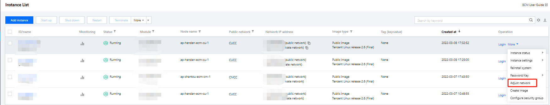 在实例列表页面,选择待调整网络的实例,单击