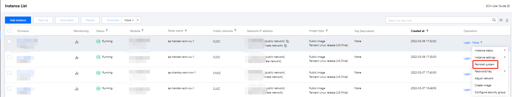 3. 在实例列表页面,选择待销毁的实例,单击更多操作 > 销毁。如下图所示: