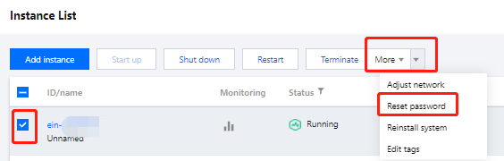 3. 在实例列表页面,勾选待重置密码的实例,单击更多操作 > 重置密码。