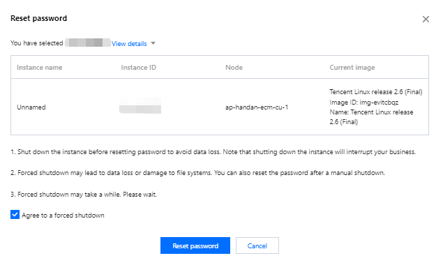 5. 勾选同意强制关机,单击重置密码,完成重置。如下图所示: