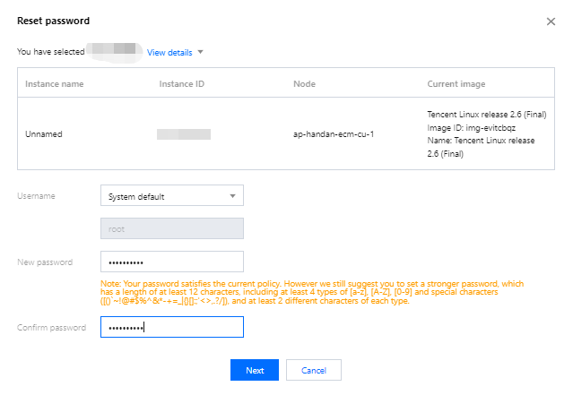4. 在弹出的窗口中,确认需要重置密码的用户名(如 Linux 实例的用户名为 root、Windows 实例的用户名为 Administrator),输入对应的新密码和 确认密码,单击下一步。如下图所示: