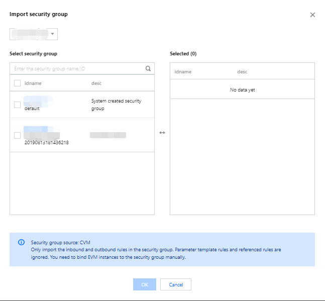 3. 在弹出的导入安全组窗口中,进行以下操作。如下图所示: