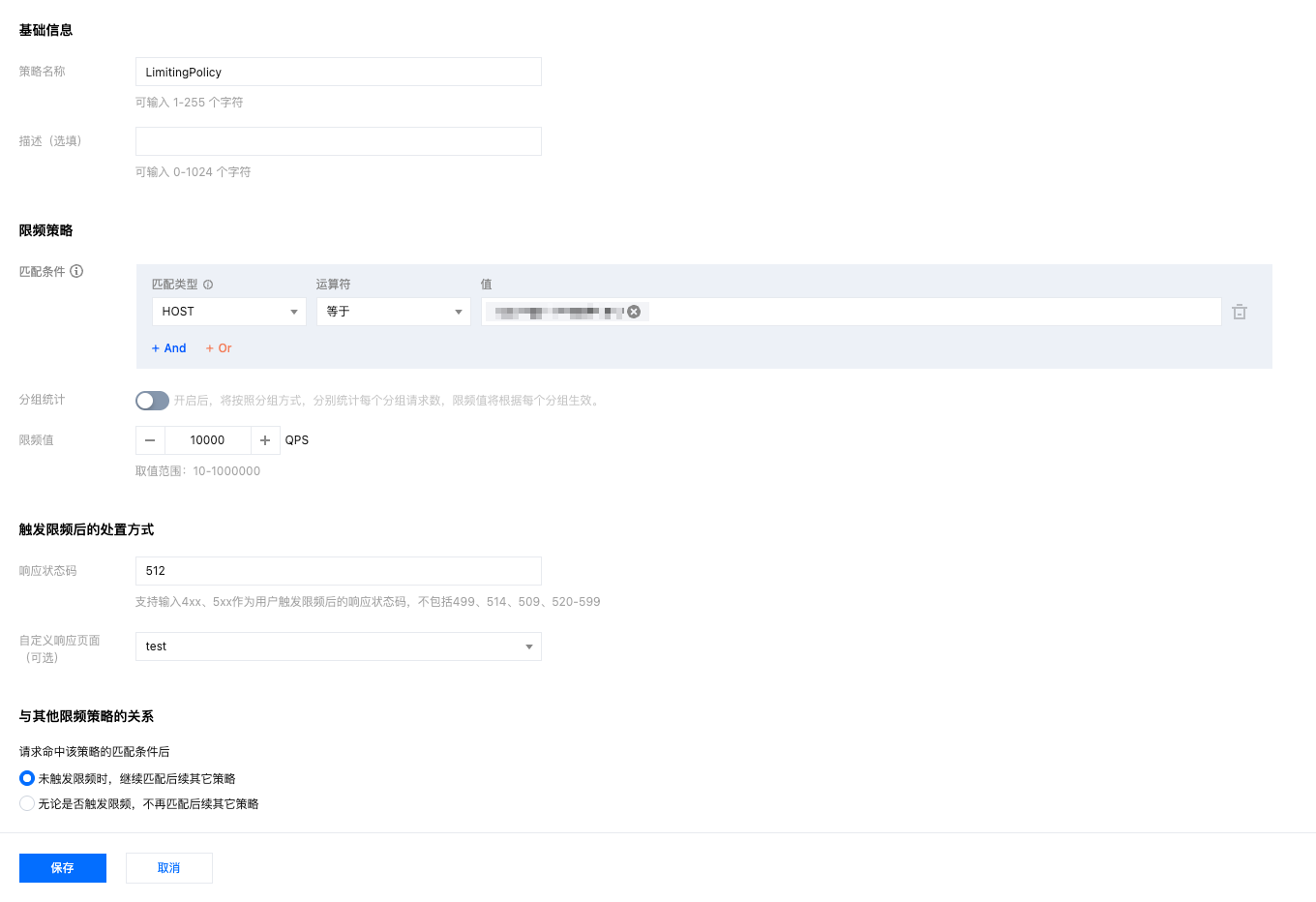 3. 单击新建策略,在策略配置界面内,参考:回源限频策略配置项说明完善配置。按照当前示例场景配置,可选择匹配条件为 HOST 等于 api.example.com,配置限频值为 10,000 QPS,在响应状态码中,输入 512。参考配置如下: