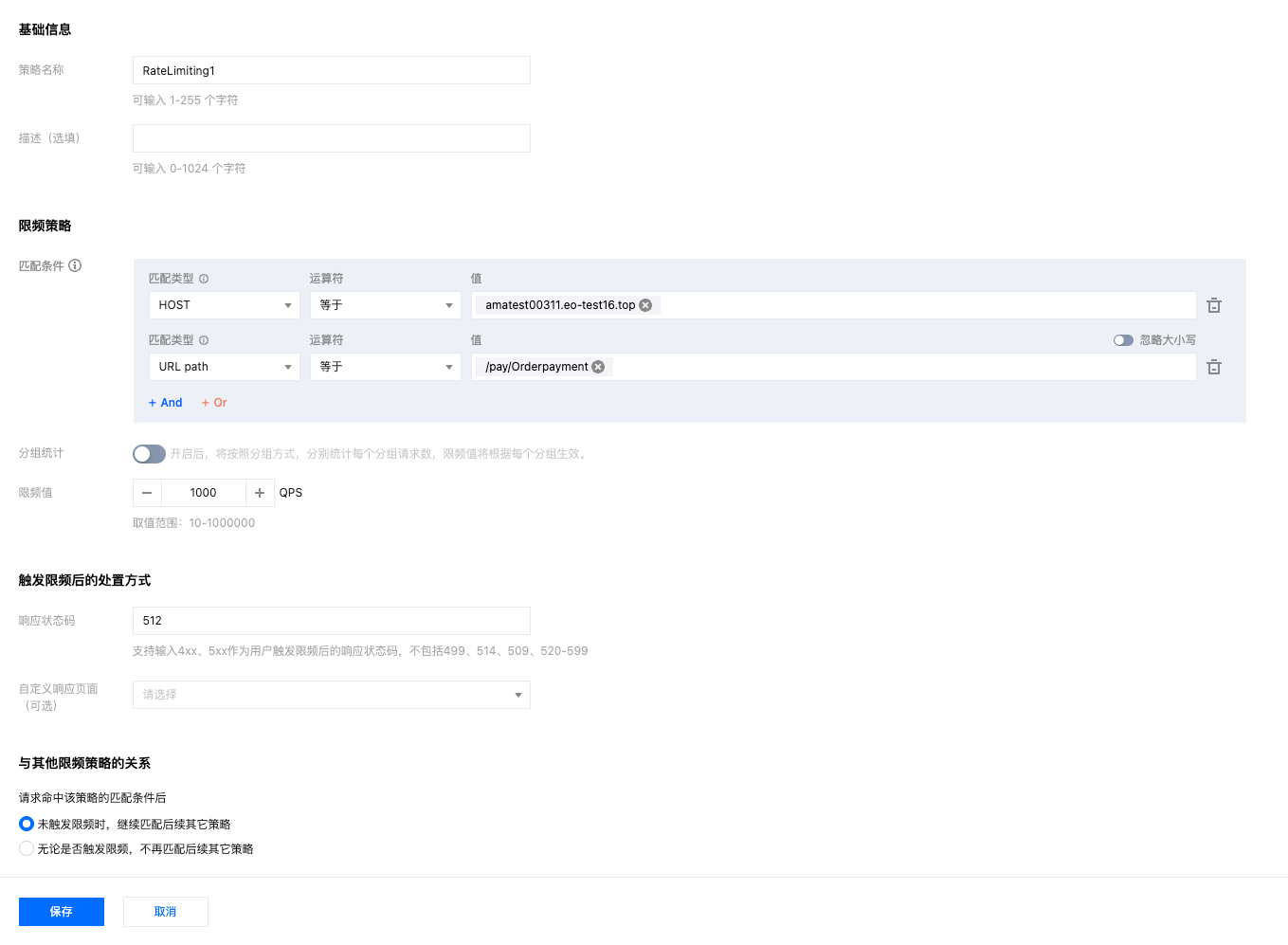 4. 点击保存,下发配置。然后重复以上步骤 3,新建一条策略 2,可选择匹配条件为 HOST 等于 api.example.com AND URL path 等于 /pay/Orderpayment,配置限频值为 500 QPS,在响应状态码中,输入 512。参考配置如下: