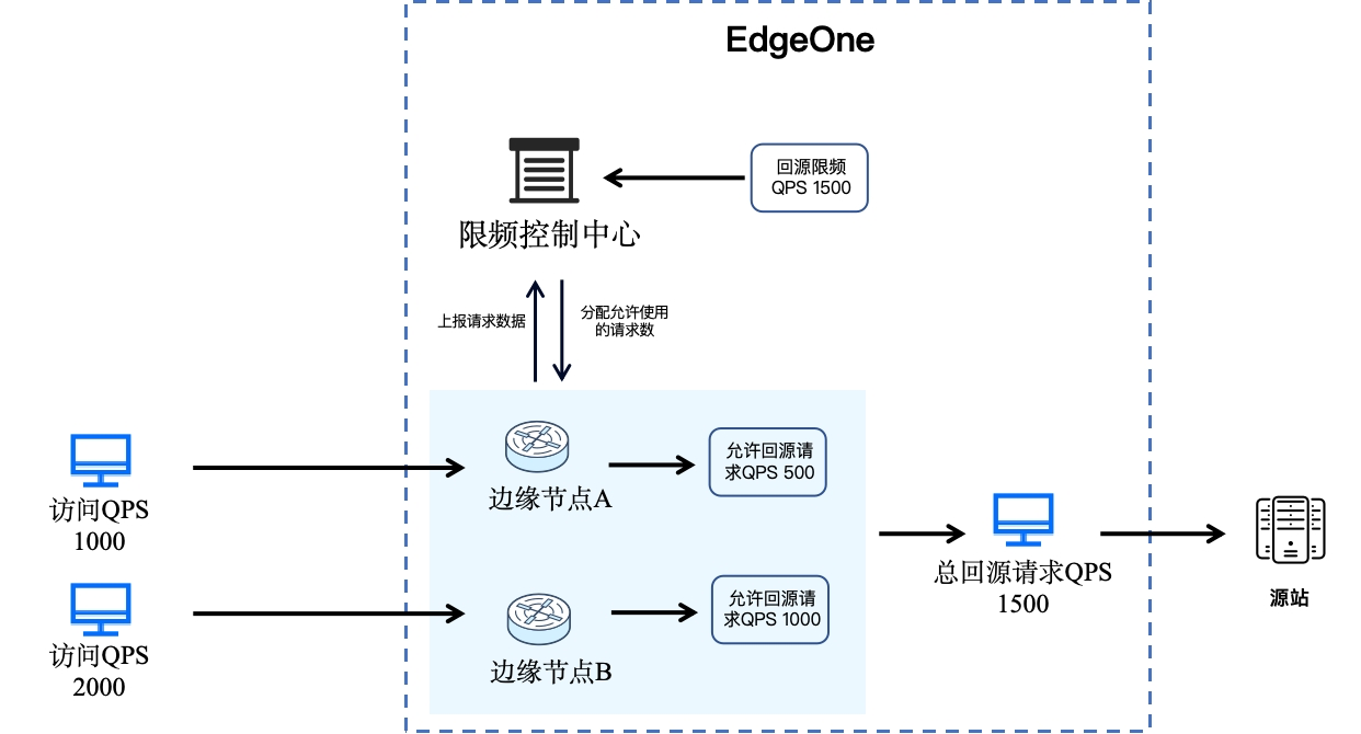 EdgeOne 为用户提供了分布全球的边缘节点服务,用户的请求将通过不同地区的边缘节点回到源站,在请求回源时,EdgeOne 将通过定期采集所有边缘节点的回源请求量,然后根据用户所设定的回源限频值以及节点数量,按一定的比例自动分配各节点的可回源 QPS 数值,并且根据边缘节点的请求量变化动态调整,确保所有节点总计的回源请求量不会超出用户所限定的回源限频值。