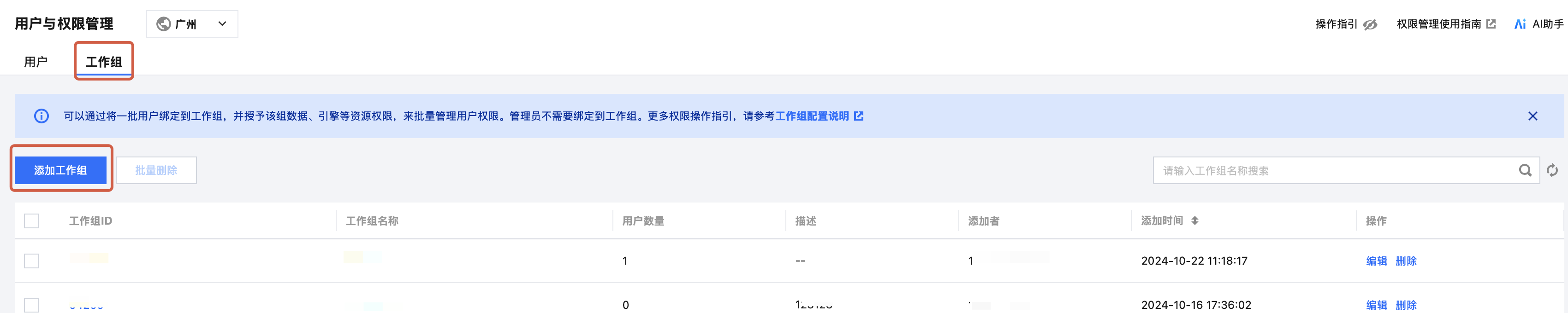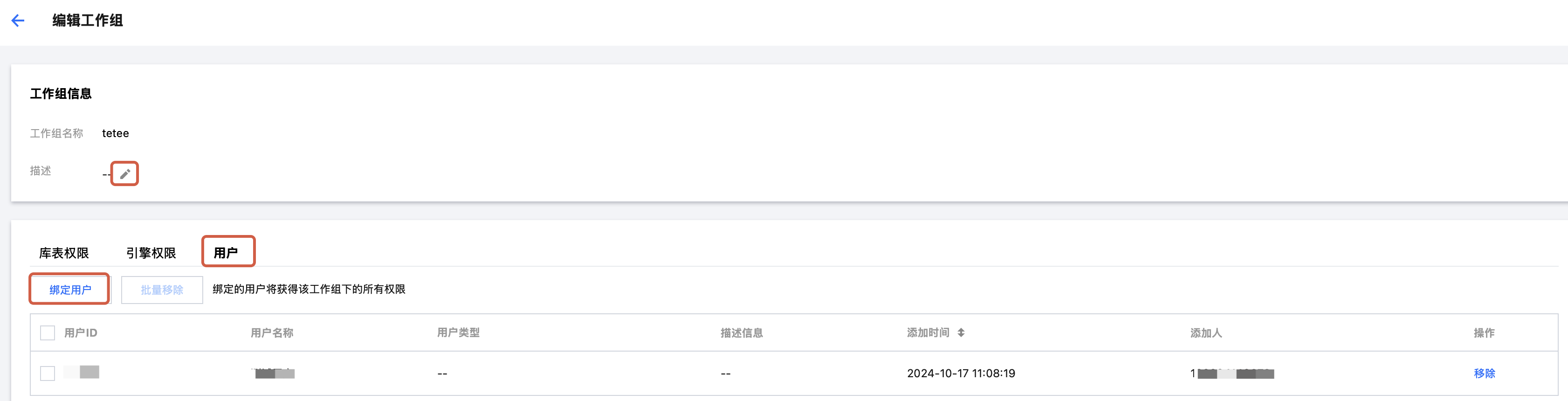 可通过绑定用户按钮将数据湖计算 DLC 内的用户添加至工作组。