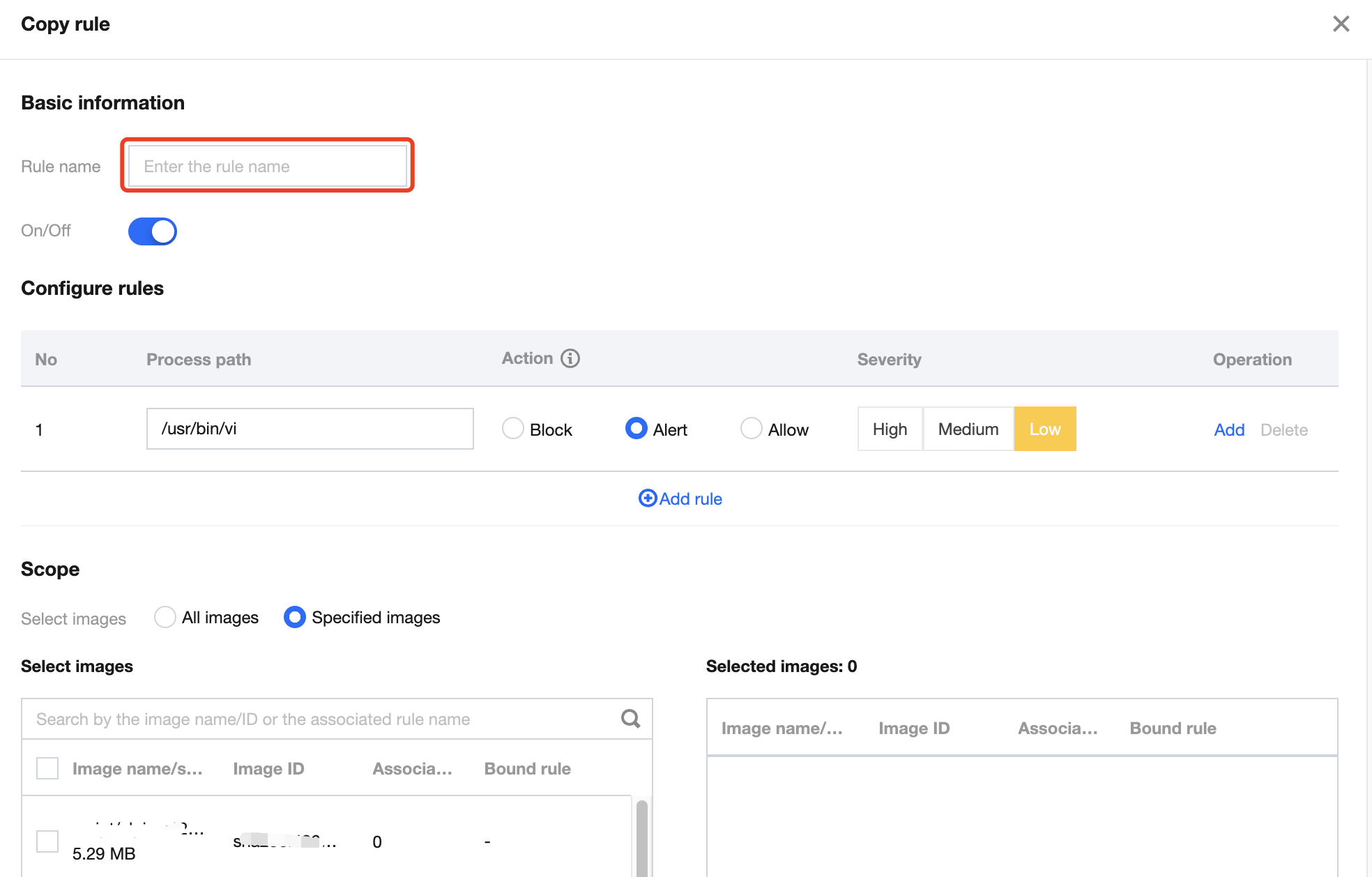 1. 登录 容器安全服务控制台,在左侧导航中,单击高级防御 > 异常进程 > 规则配置,进入规则配置页面。 2. 在规则配置页面,单击右侧复制,右侧弹出复制规则页面。